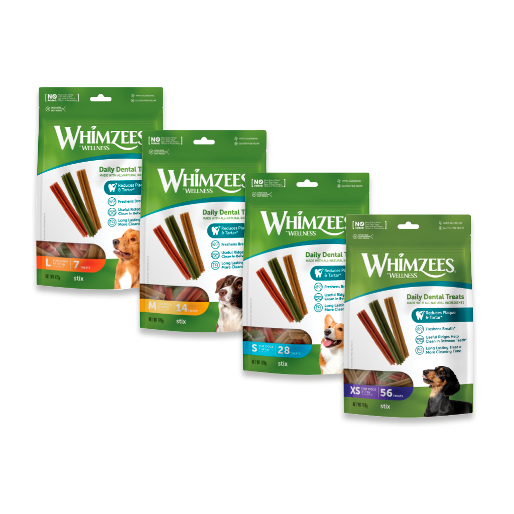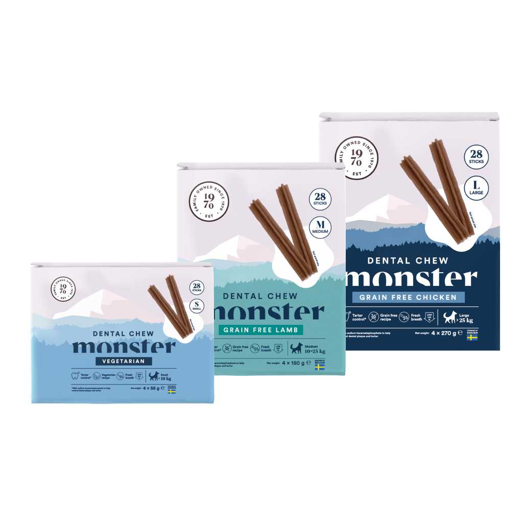 Velsmakende tygg med aktive mineraler som reduserer dannelsen av plakk og tannstein. Lam, kylling eller vegetar.
