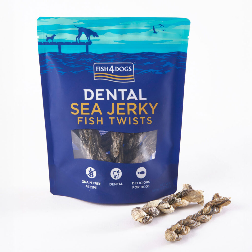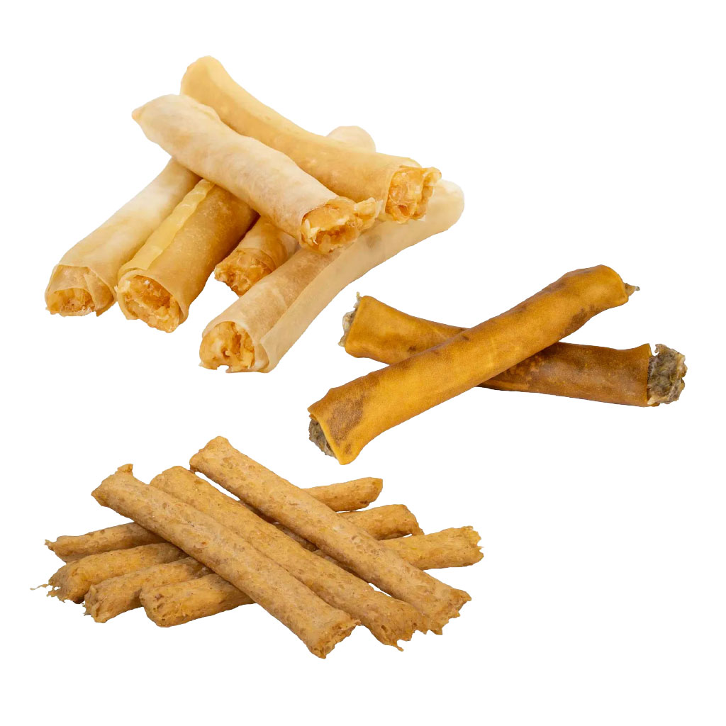 Tygg laget av tvinnet biter av fiskeskinn som hunden kan holde mellom potene. Disse inneholder ingen tilsetningsstoffer.